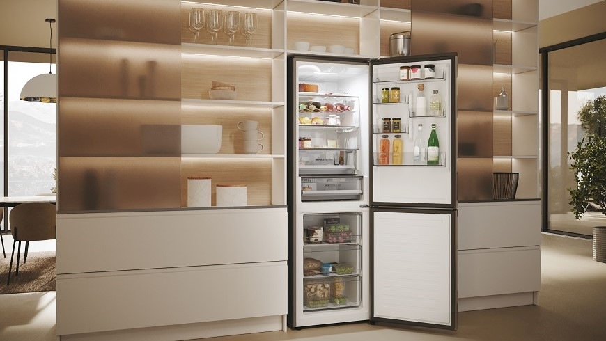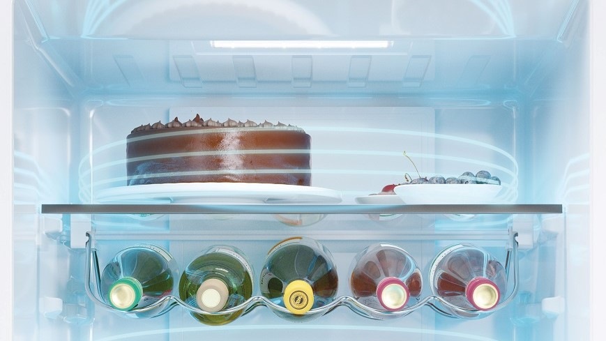 Potraviny, které vyžadují vlhké prostředí můžete uskladnit v zásuvce Humidity Zone s HCS filtrem na horní stěně, který udržuje optimální vlhkost do 90 %. Toto ideální prostředí zajistí dvakrát tak delší čerstvost a šťavnatost. Zásuvka My Zone je ideální pro uchování ovoce, zeleniny, sýrů a má funkci nulové zóny. Rovnoměrná distribuce vzduchu po celém obvodu chladničky pomocí technologie Air Surround Total No Frost přispívá po celou dobu skladování k udržení chuti potravin s minimální ztrátou nutričních hodnot. Navíc už nikdy nemusíte ručně odmrazovat. Uvnitř chladničky také najdete praktický držák na lahve, který lze sklopit zpět do vodorovné polohy a vytvořit tak ještě více prostoru.