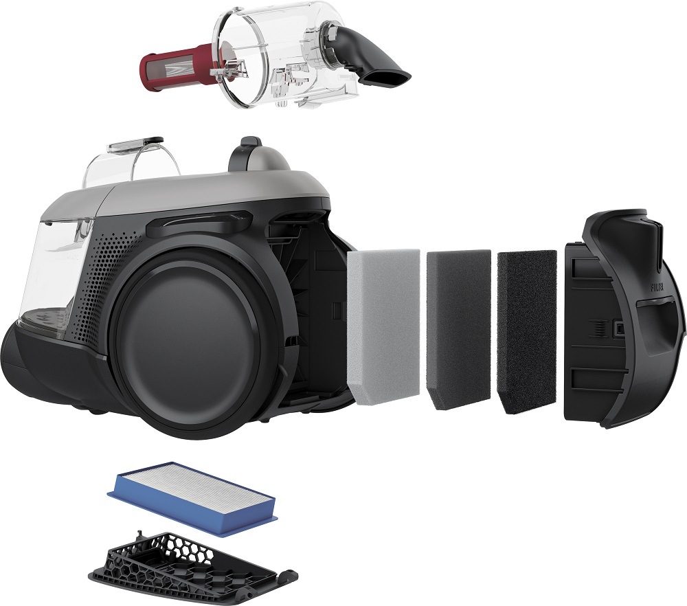 bezsáčkový vysavač • příkon 550 W • cyklónová technologie vysávání • 12m akční radius • omyvatelný Hygiene Filter • šestistupňová filtrace • hlučnost 74 dB • příslušenství: hubice DustMagnet Silent, parketová hubice, mini turbo kartáč, Animal Kit, nesené příslušenství 3 v 1